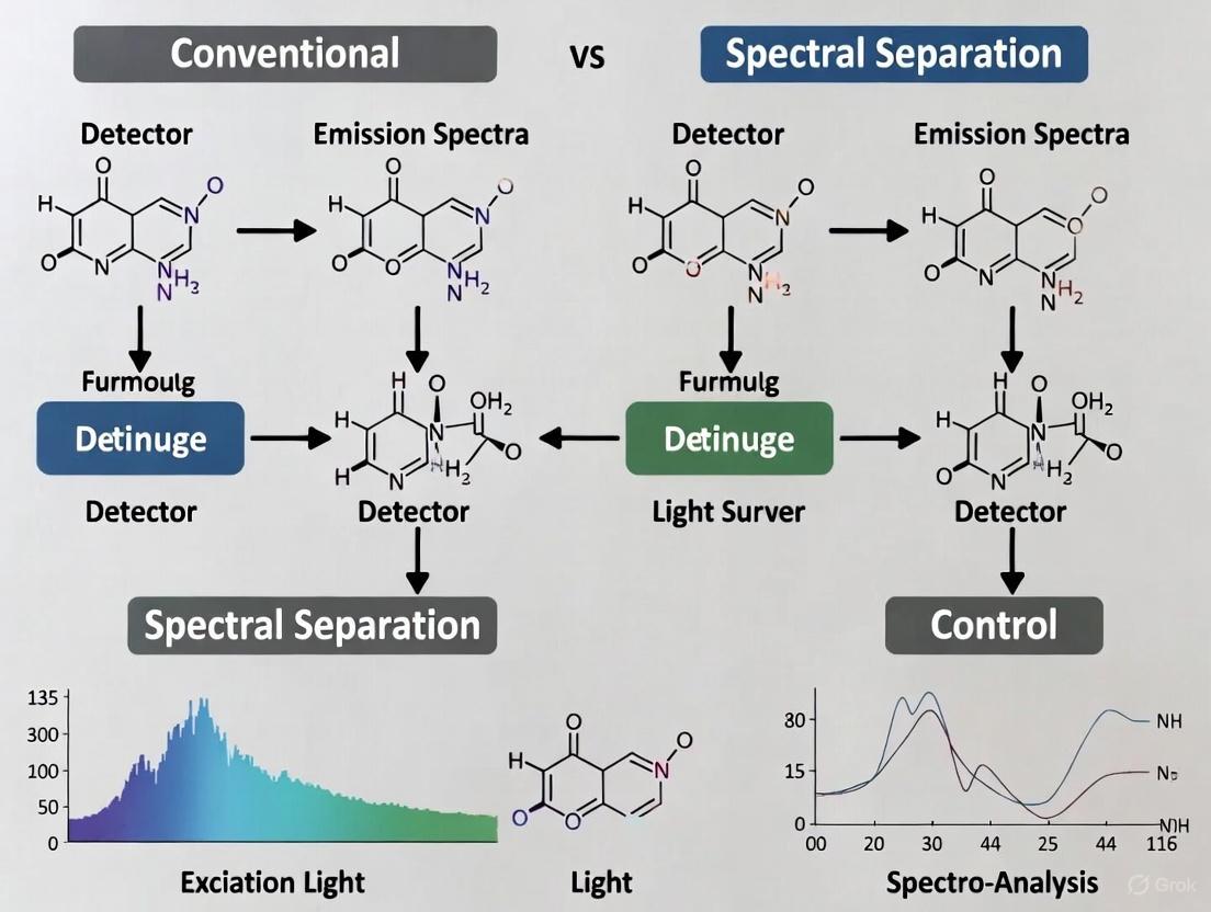 Experimental data underscores the practical impact of these mathematical differences. One study demonstrated that Poisson unmixing provided superior results compared to OLS, particularly for dim fluorescent populations, as assessed by lower absolute/relative errors and a smaller Kullback-Leibler divergence between known and approximated populations [8]. Furthermore, the ability of spectral unmixing to resolve fluorophores with high similarity indices (up to ~0.98) allows for panel designs that are impossible with conventional cytometry, where fluorophores with overlapping emission spectra cannot be used together [9].